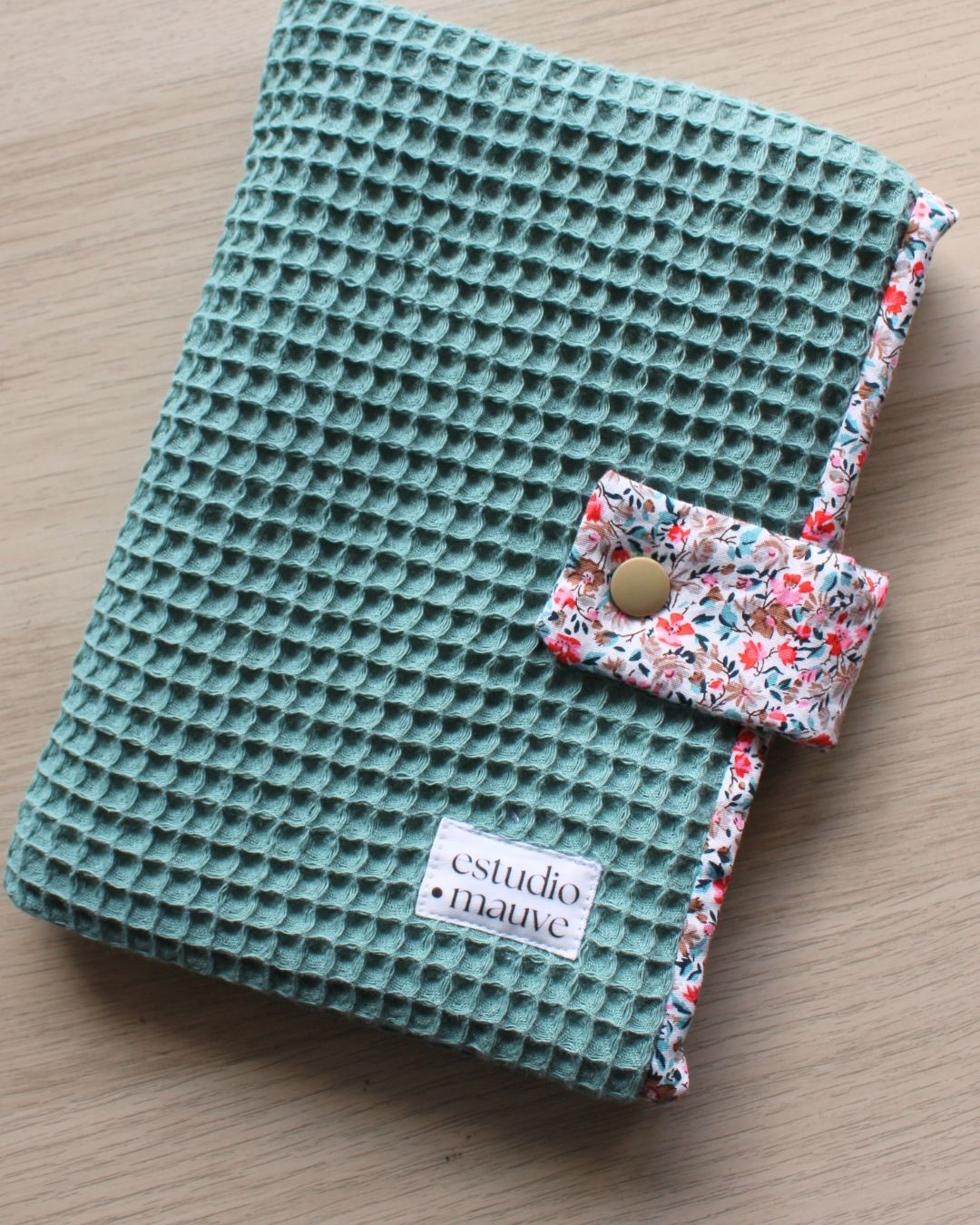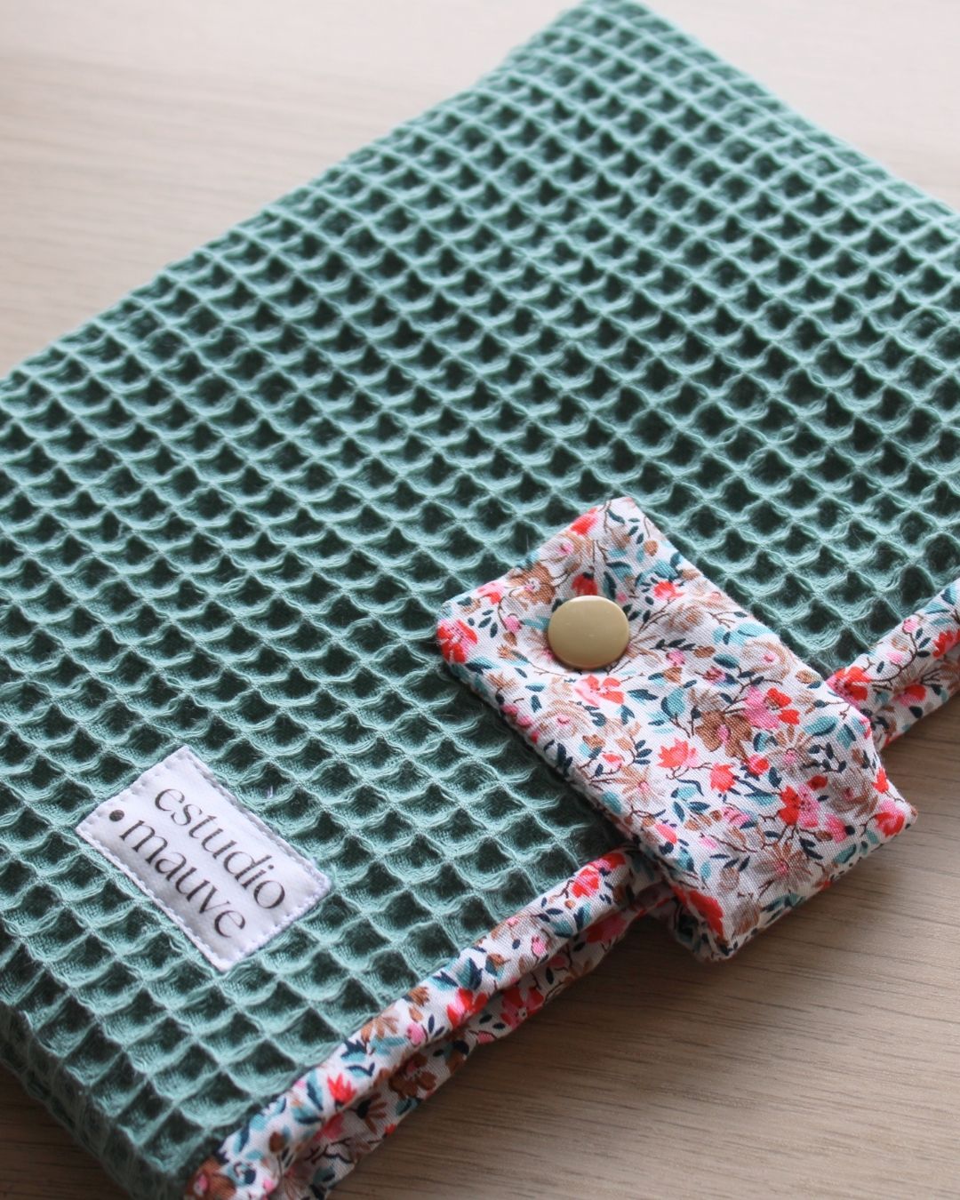 Funda hecha a mano con tela waffle en el exterior y algodón estampado en el interior. Cuenta con un cierre lateral con botón que mantiene tu Kindle protegido en todo momento.