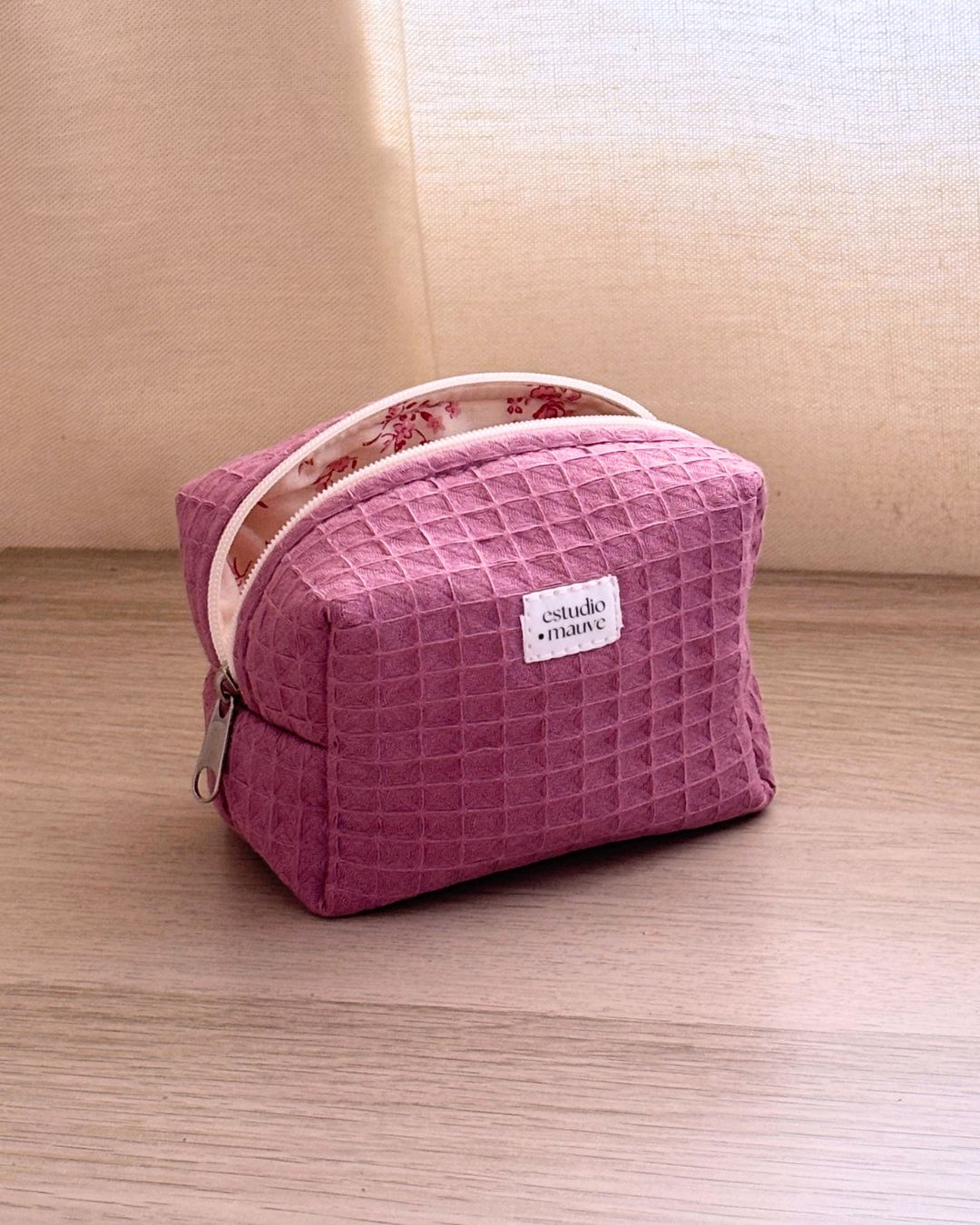 Neceser hecho a mano con exterior de tela waffle y forro interior de algodón estampado de flores. Disponible en tres tamaños —maxi, mediano y mini— para adaptarse a tus necesidades. Perfecto para organizar maquillaje, productos de cuidado personal o accesorios, tanto en casa como de viaje.